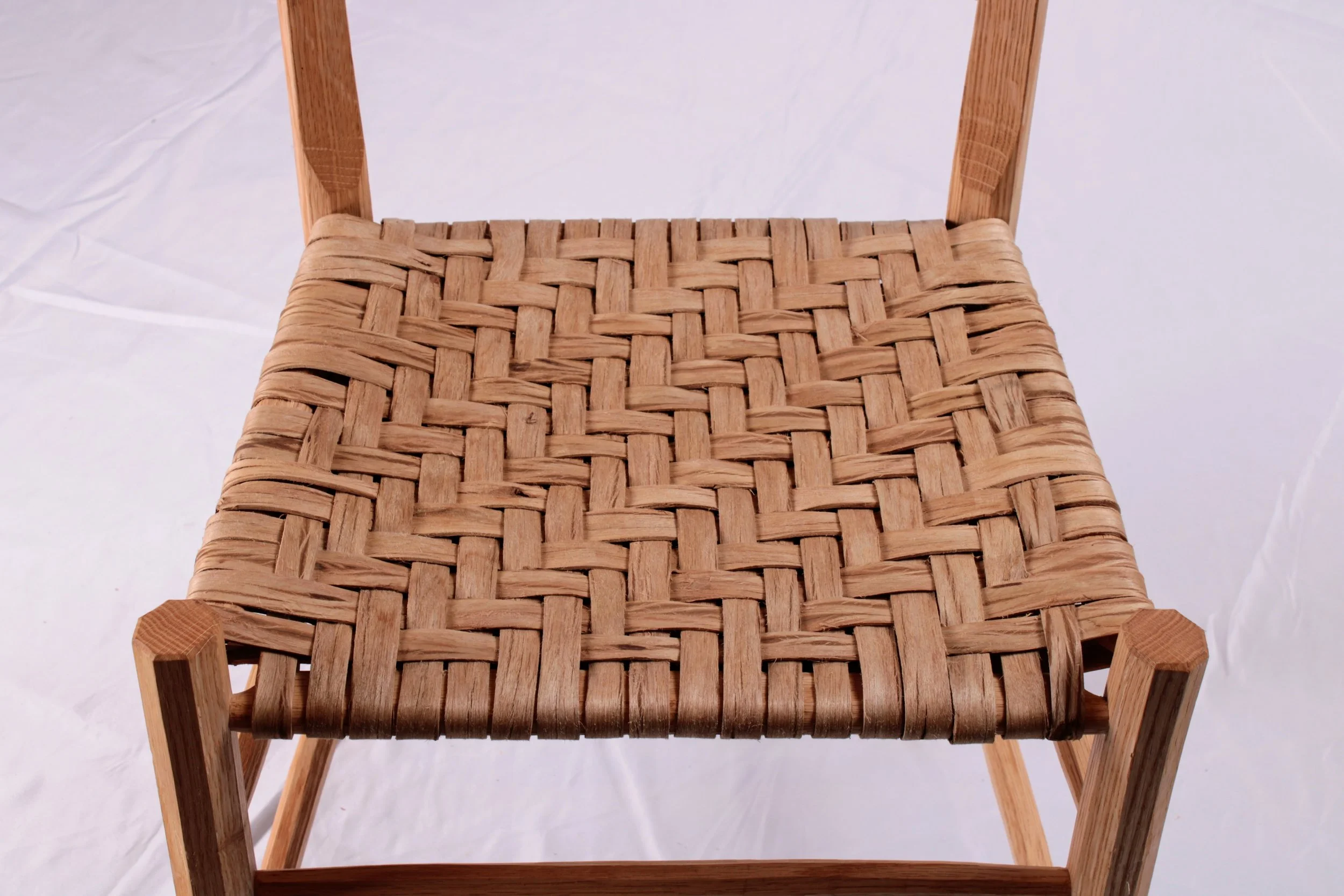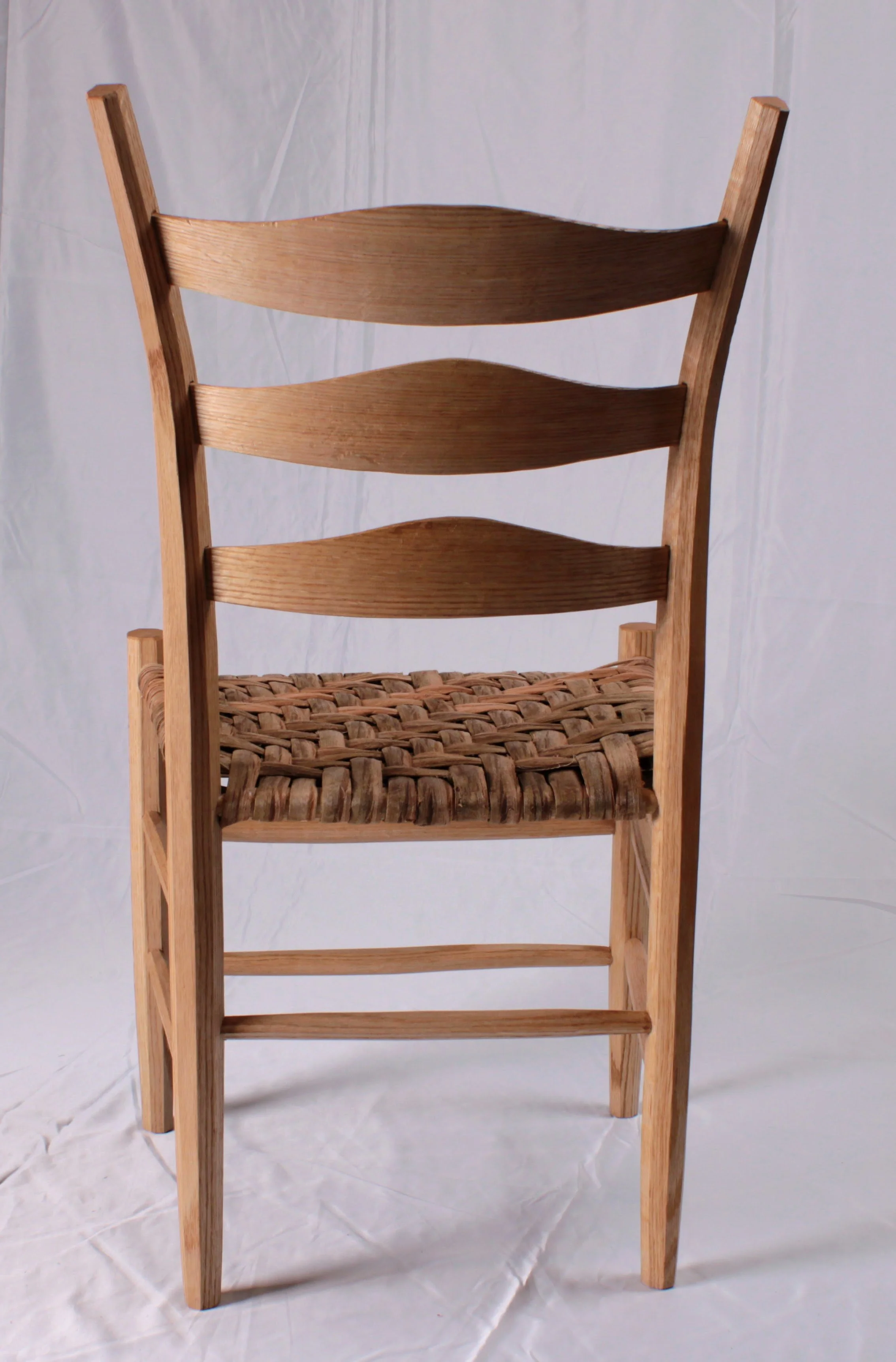 I learned to make this chair in a class with Andy Glenn. It is a classic 3 slat ladder back as described in his wonderful book. These are similar to the JA chair, being also post and rung construction but with 3 slats instead of 2 and a significantly heavier duty construction. These seats are hickory bark, but can be made with any type of material used for woven seats. A rustic but beautiful chair.