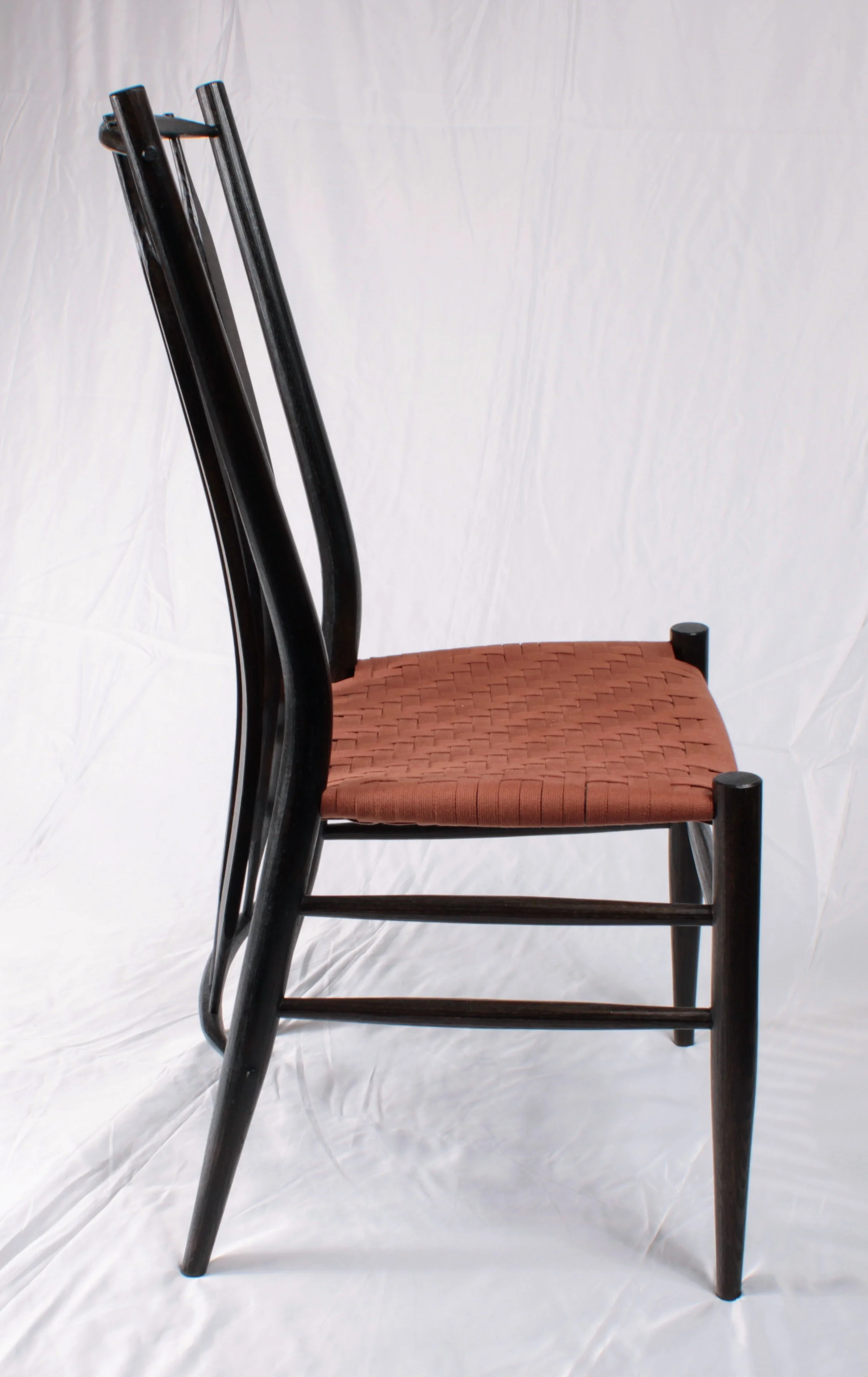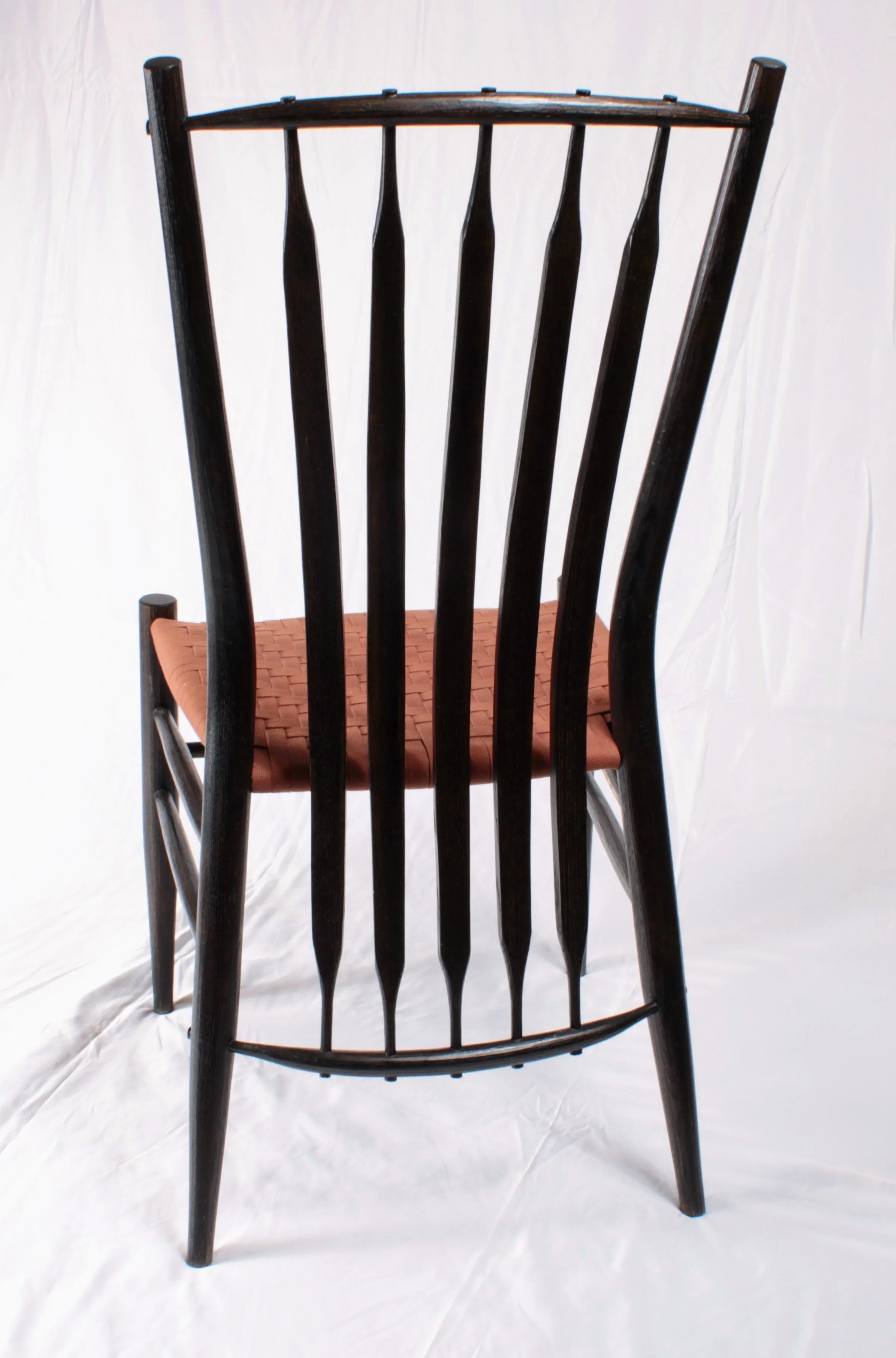 This is a design by Eric Cannizzaro. It is quite different from your “standard” Windsor chair, although the techniques used in building it are very similar. The seat is woven with Shaker tape, although a number of different seating options are available. I like how the crest rail is mirrored by the lower “crest” rail, and how the ends of the spindles are left proud of the crest rail, which mirrors the upper ends of the back post. It is a challenging chair to build - none of these parts are turned, they are all shaped with drawknife and spokeshave. The wood is all White Ash, which has been dyed with a Walnut aniline dye.