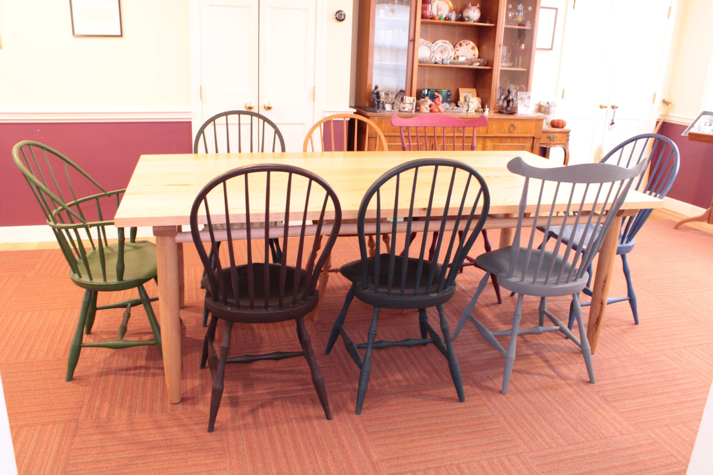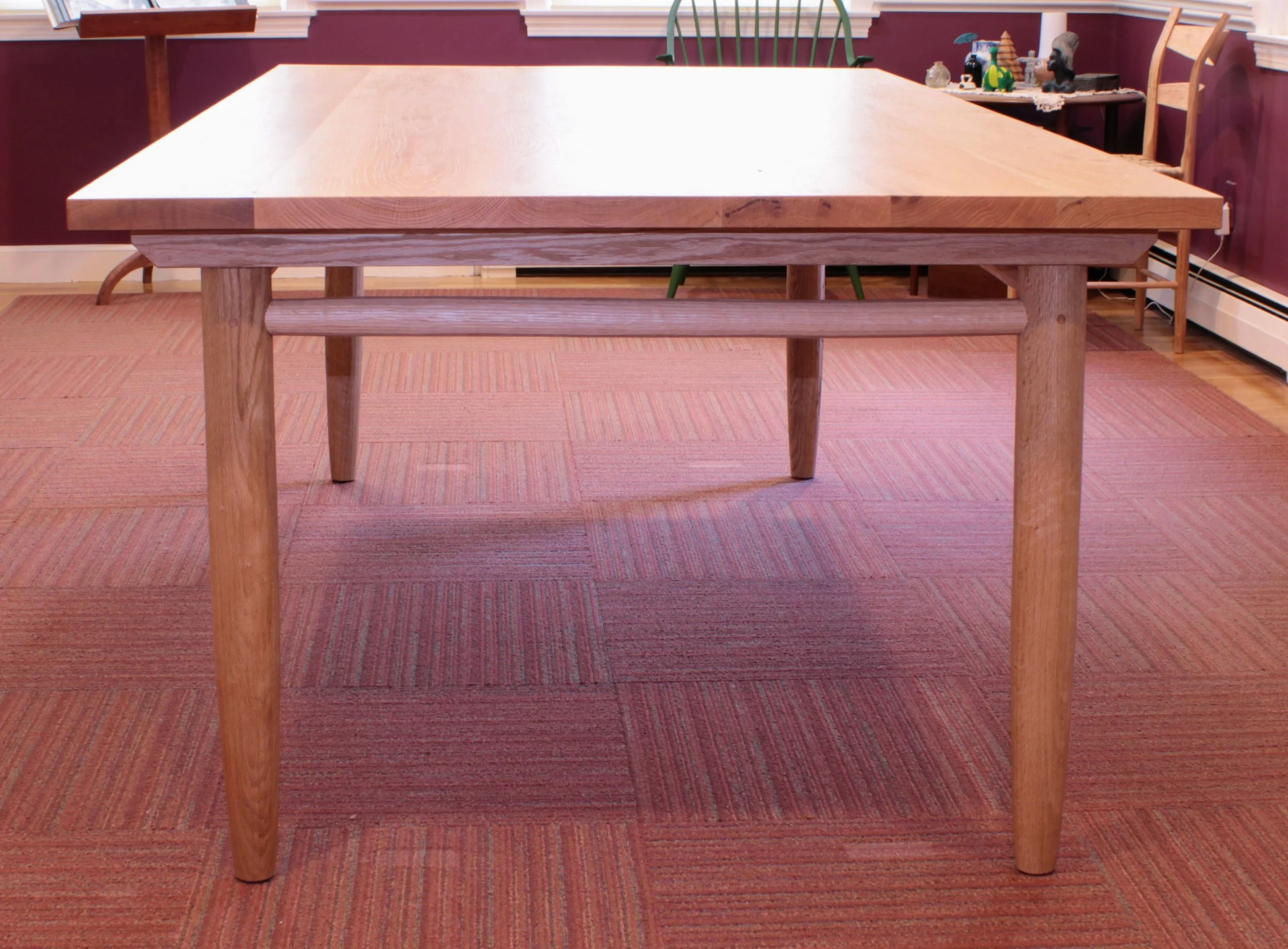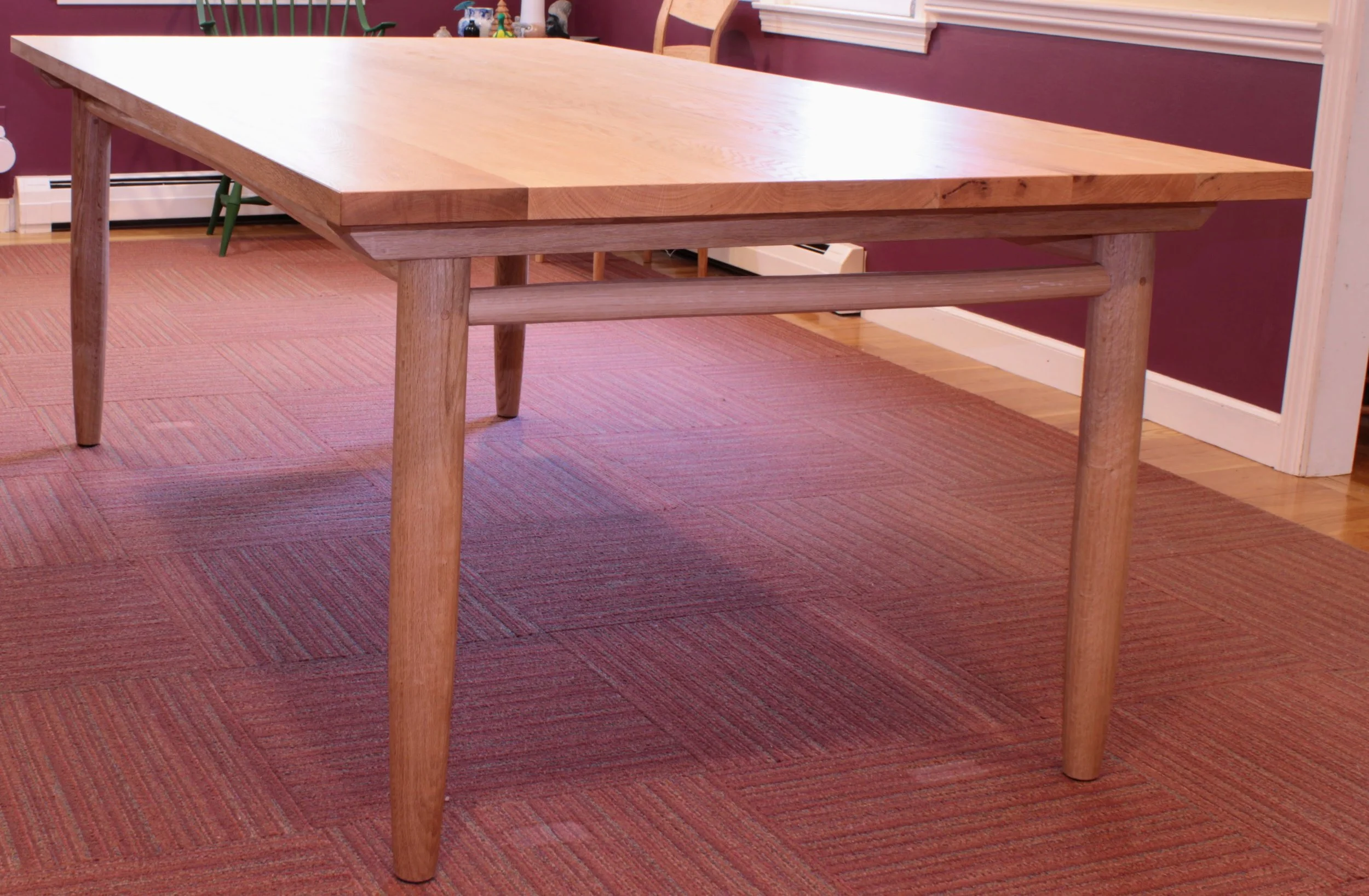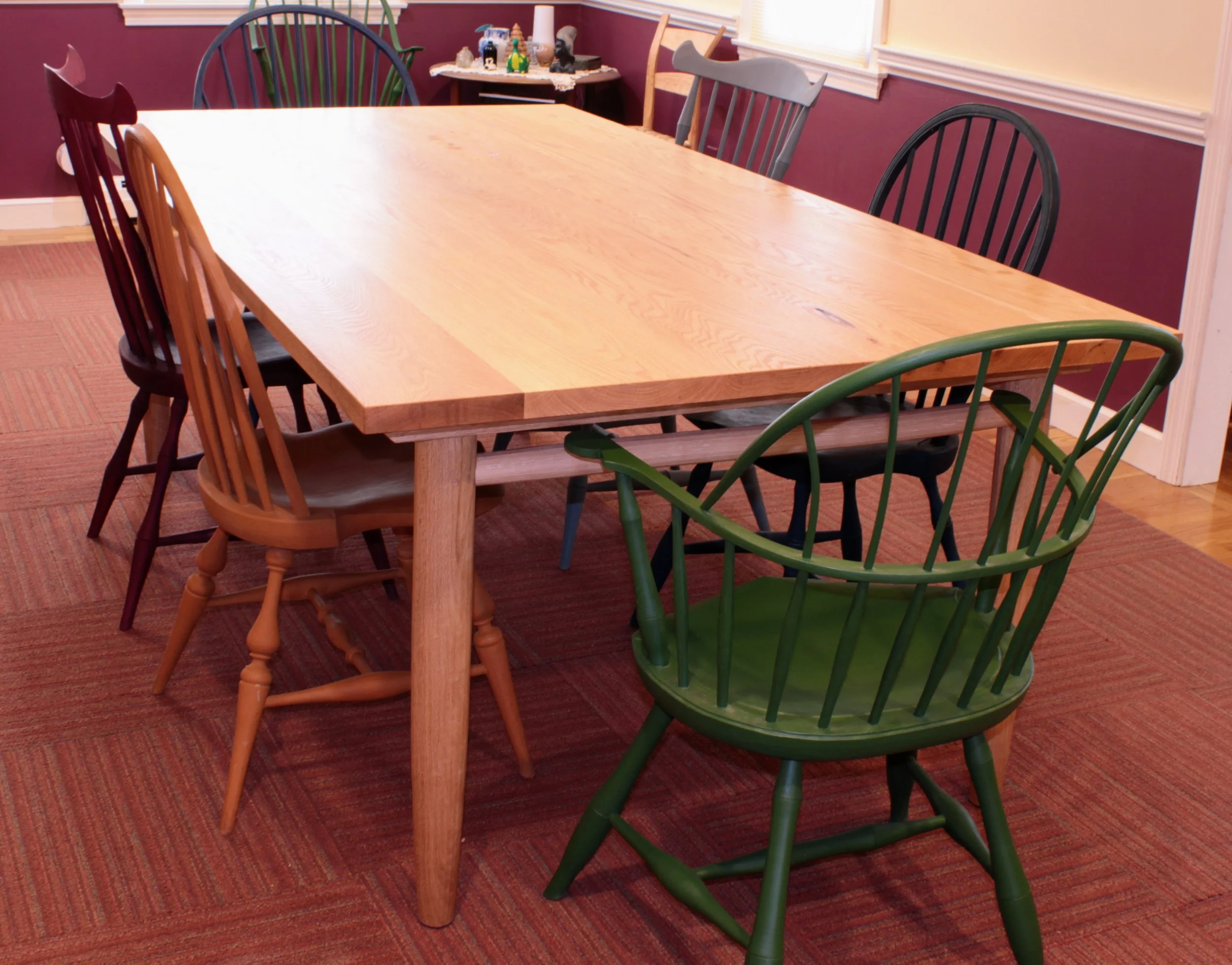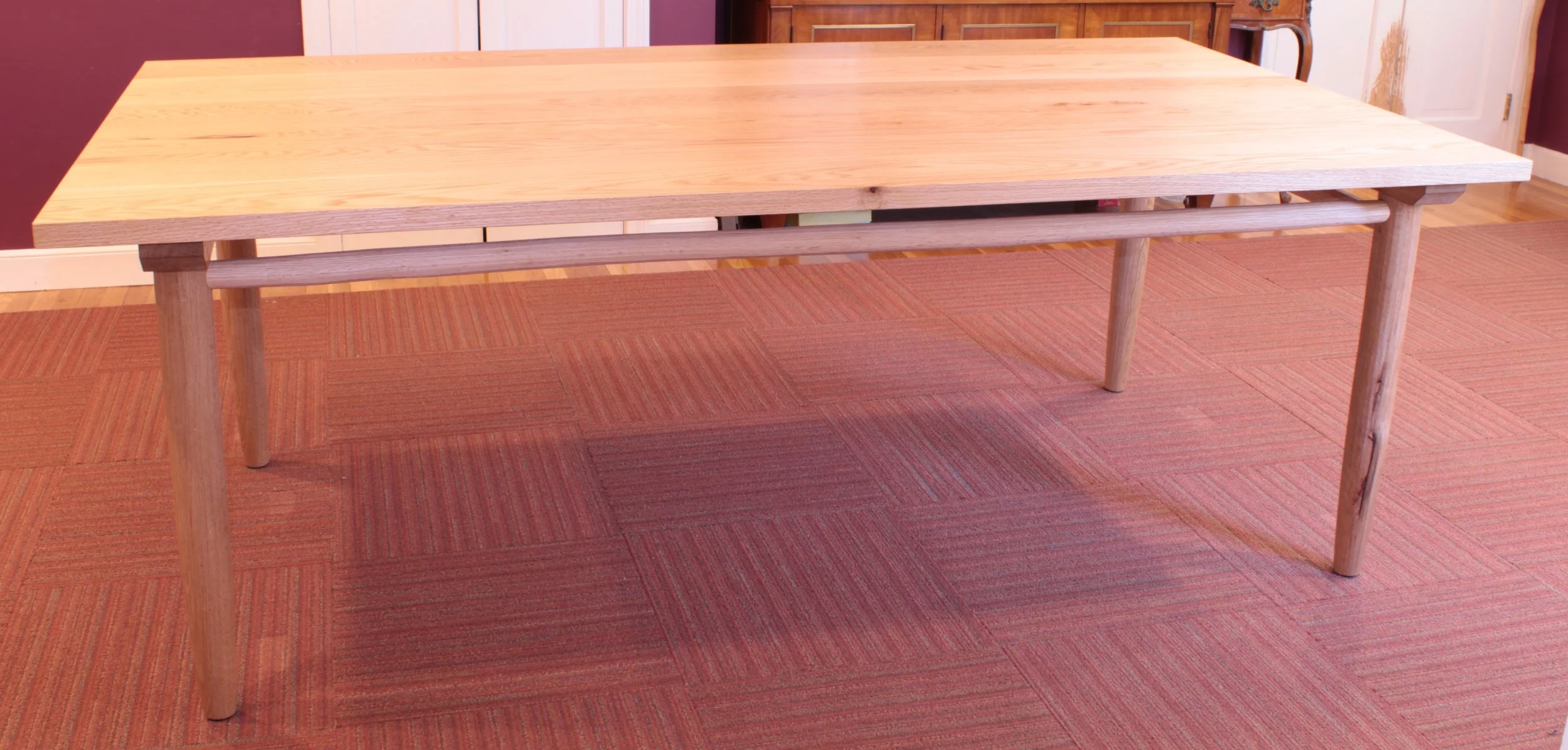 I built this table shortly after learning to make the Jennie Alexander (JA) chair. The rails are riven from green wood, and then shaped with a drawknife and spokeshave, and the rail to leg joinery is the same as in the JA chair with an added peg through the leg and rail just for piece of mind. The rest of the table is all from kiln dried wood. The legs are turned, and then given a spokeshave finish - they each have 24 small facets.